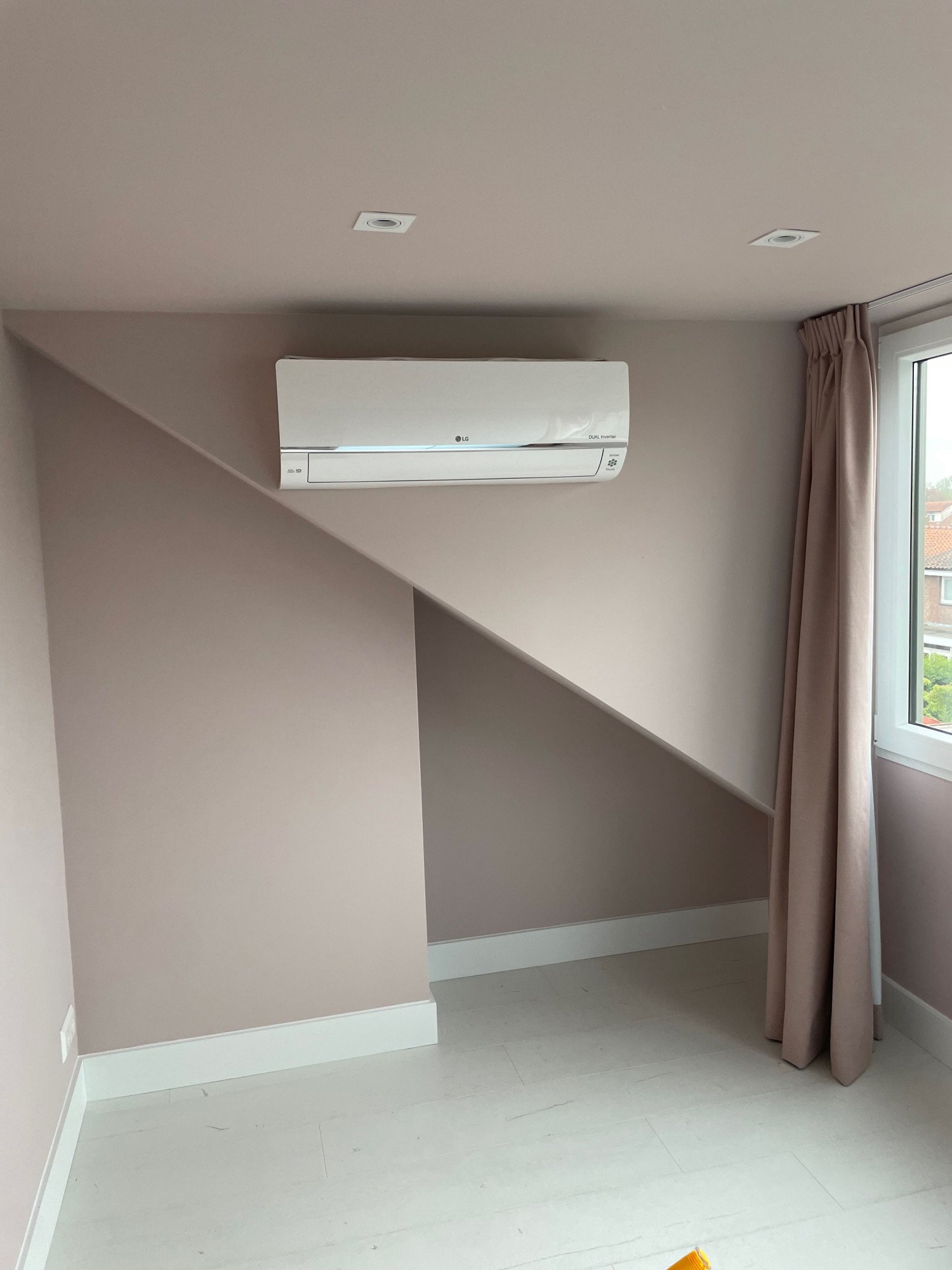 De opdrachtgever wil de vier slaapkamers van de woning graag voorzien van airconditioning. In twee van de vier slaapkamers is een dakkapel aanwezig, op verzoek plaatsen we de binnenunits tegen de buitenwand van die dakkapellen. Daar zie je aan de buitenkant overigens helemaal niets van. In de andere slaapkamers is gebruik gemaakt van een condenspompje zodat er geen leidingwerk zichtbaar is.