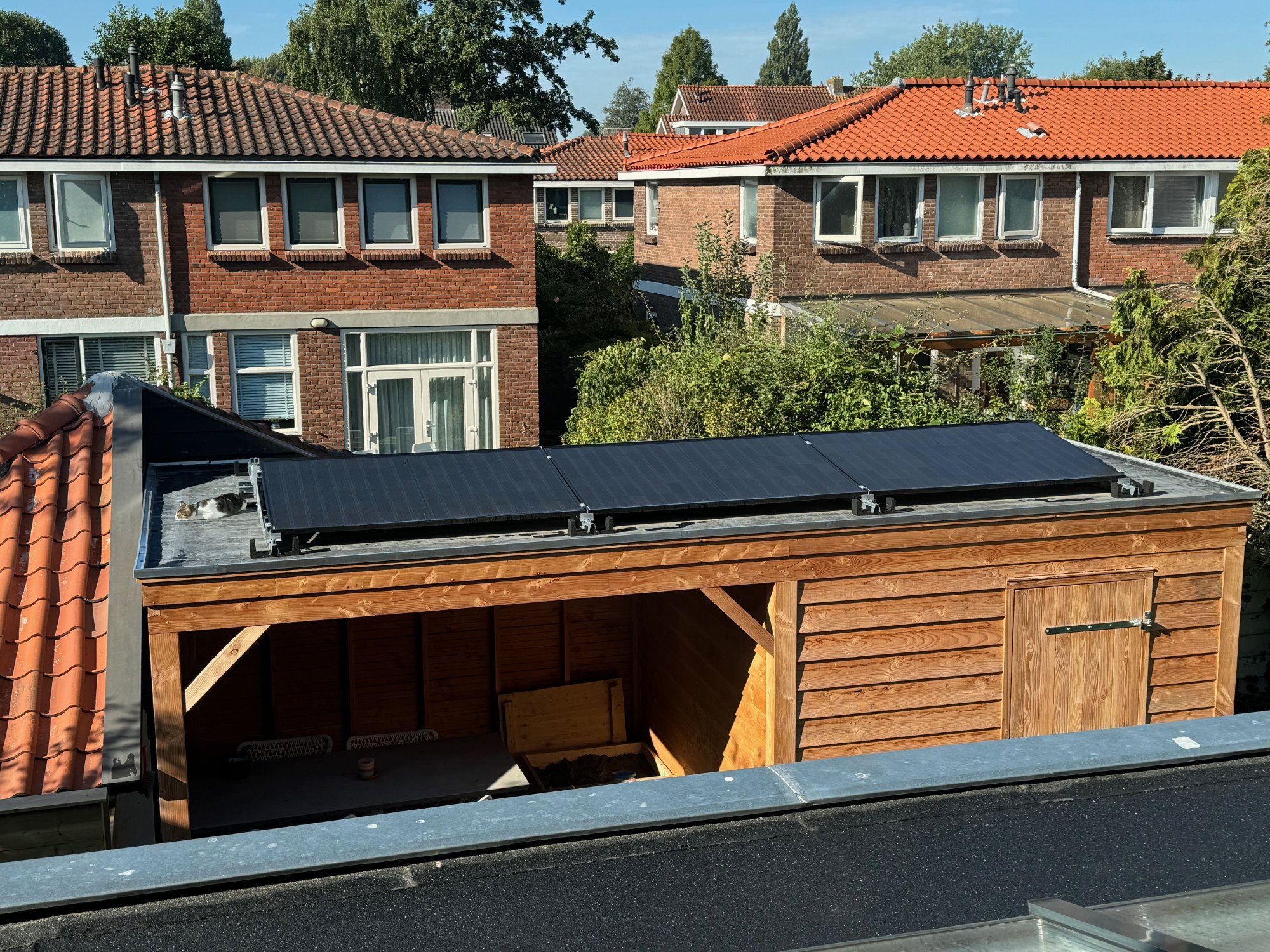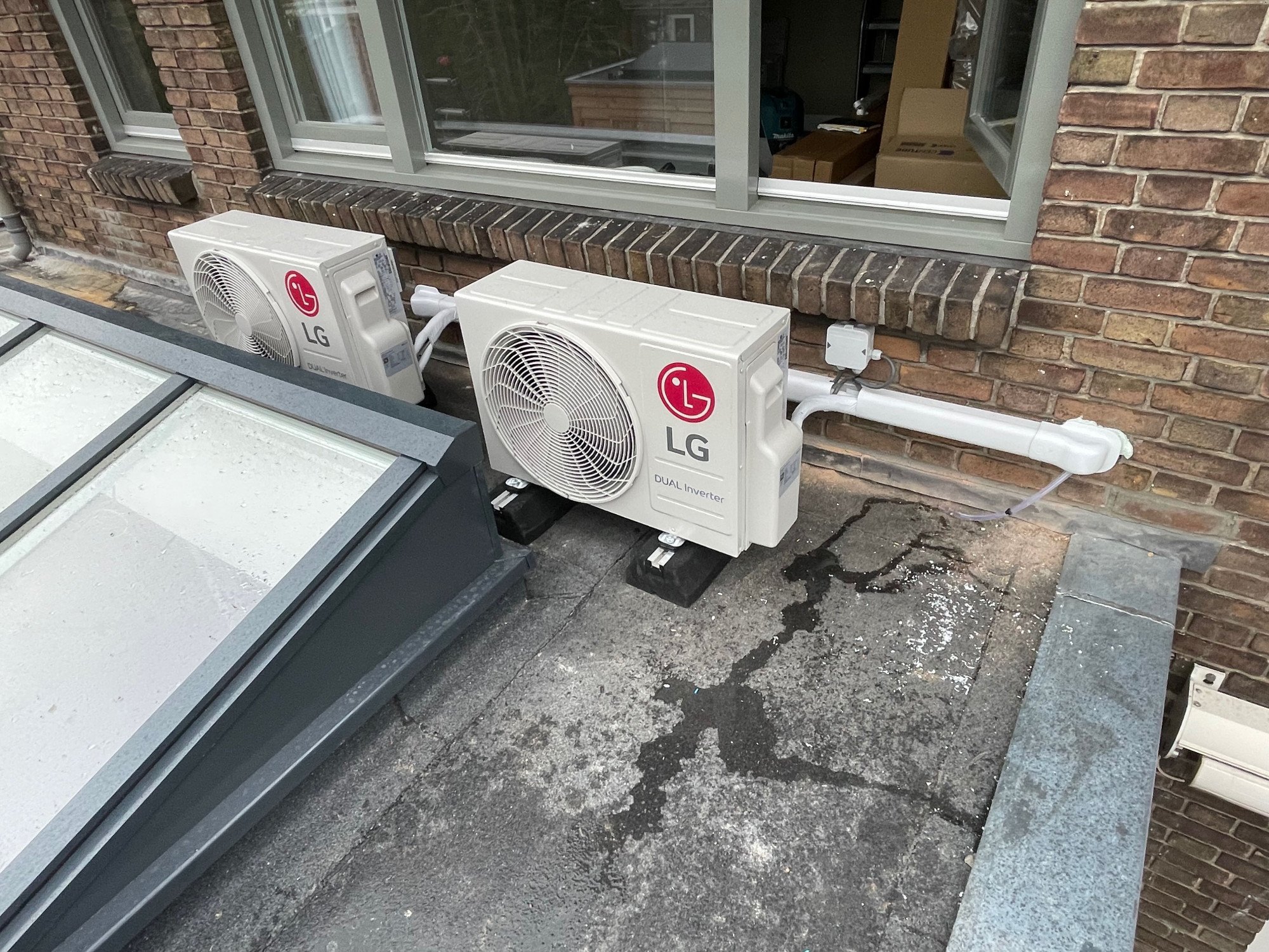De buitenunits zijn uit het zicht geplaatst, op het platte dak van de aanbouw.